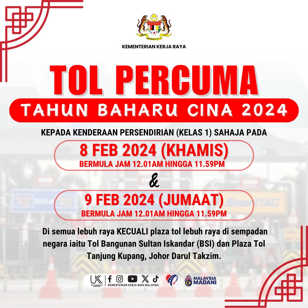 PEMBERIAN TOL PERCUMA SEMPENA SAMBUTAN PERAYAAN TAHUN BARU CINA TAHUN 2024
