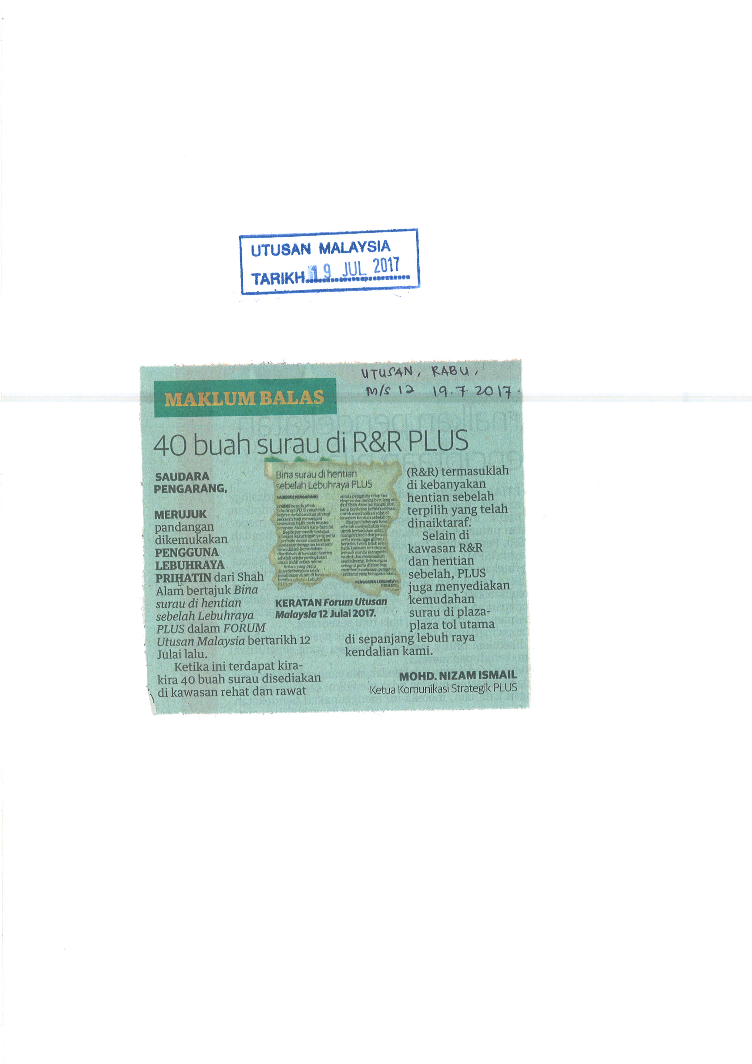 Tarikh Rab, 19/07/2017 - 12:00 Surat Khabar Utusan Malaysia File attachments UM 19072017- 40 Buah Suaru Di R&R PLUS_0.jpg (693.96 KB)