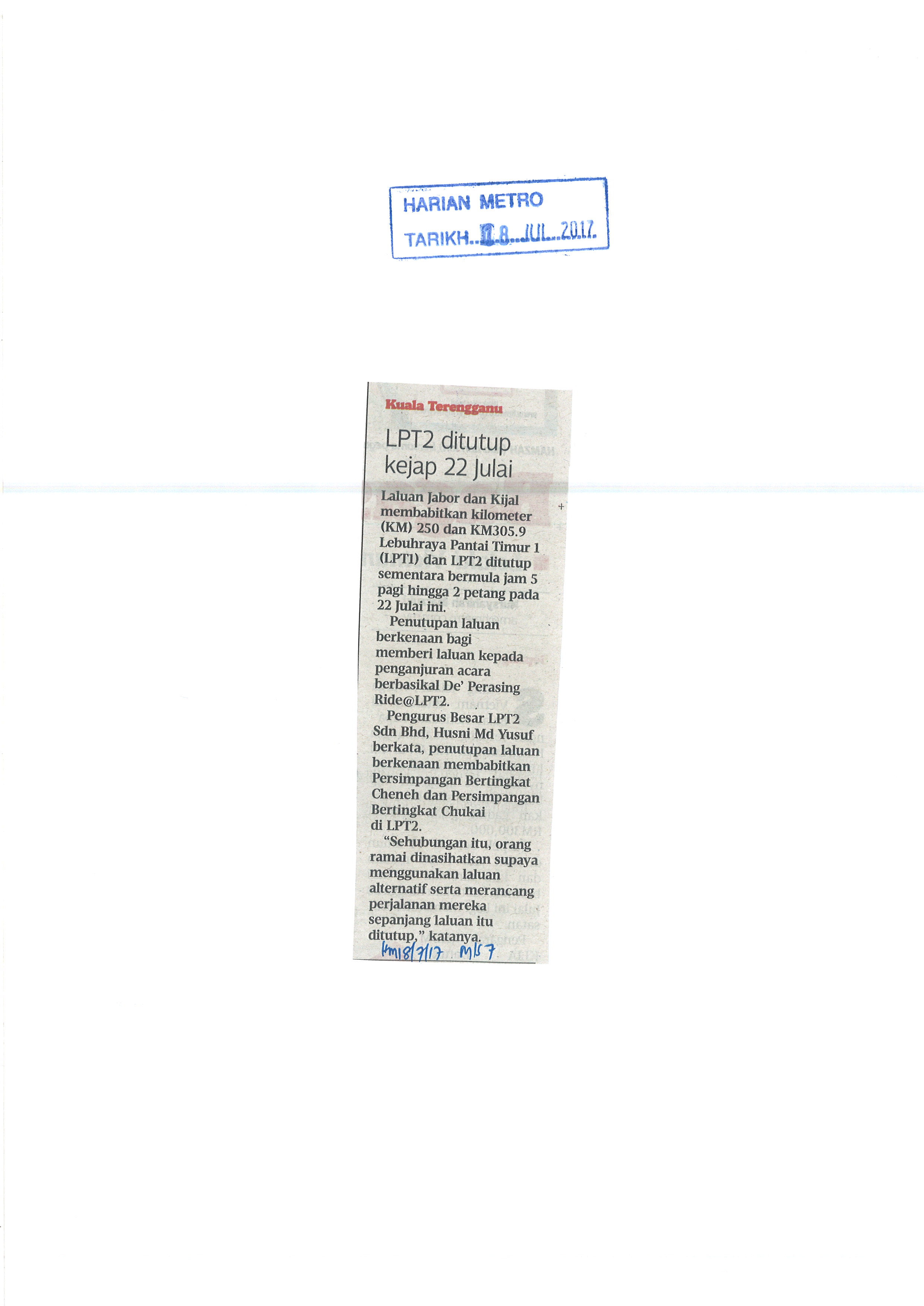 Tarikh Sel, 18/07/2017 - 12:00 Surat Khabar Harian Metro File attachments HM 18072017- LPT 2 ditutup kejap 22 Julai_0.jpg (475.19 KB)