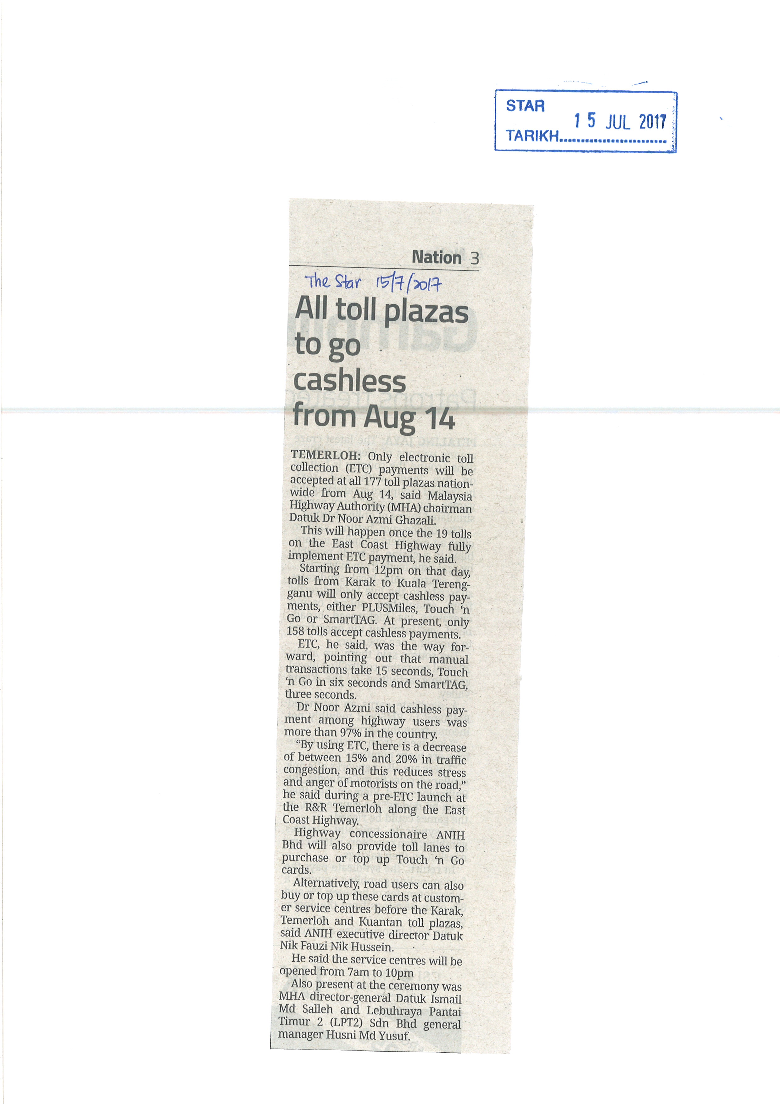 Tarikh Sab, 15/07/2017 - 12:00 Surat Khabar The Star File attachments STAR 15072017- All Toll Plazas To Go Cashless From Aug 14_0.jpg (854.62 KB)