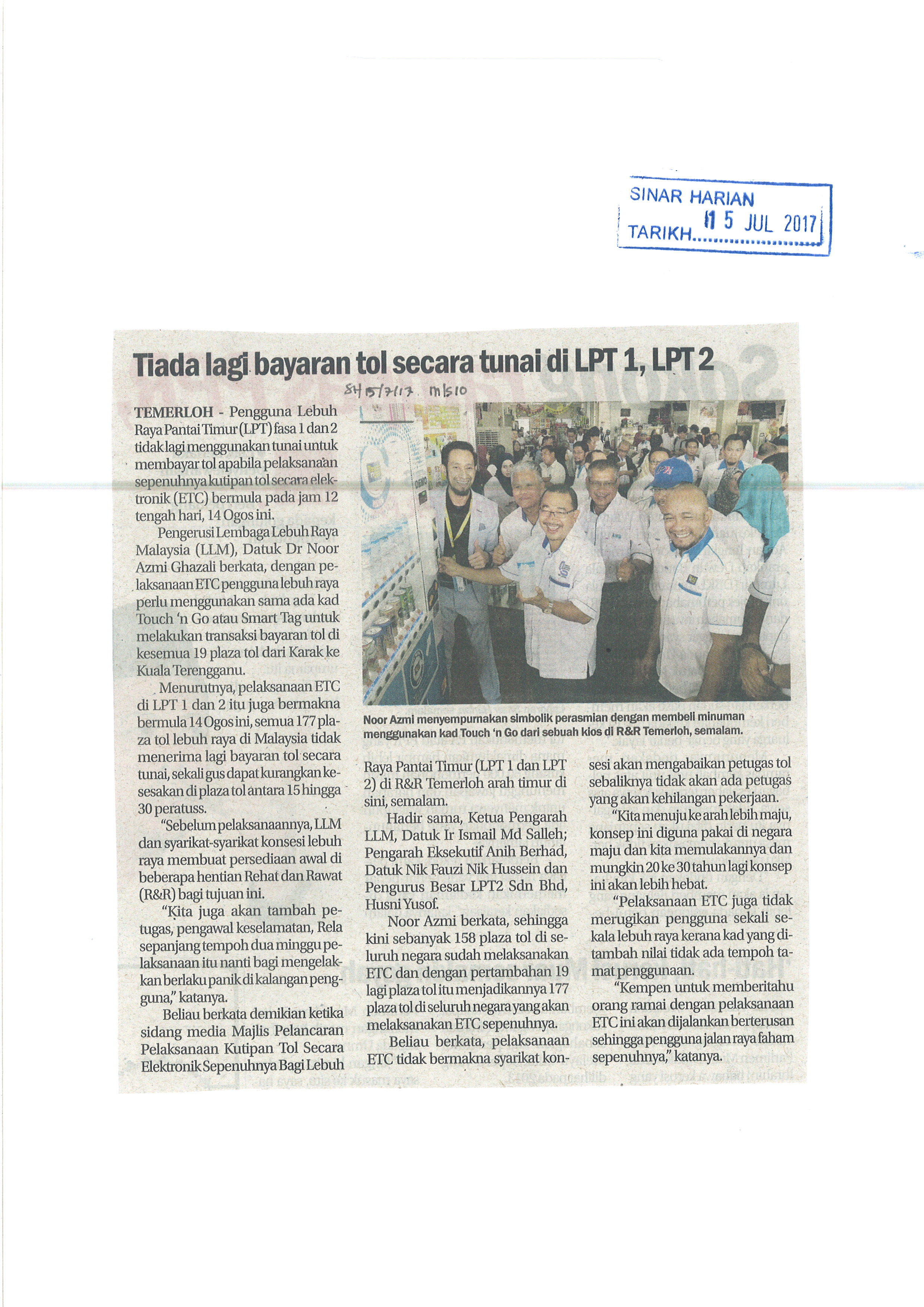 Tarikh Sab, 15/07/2017 - 12:00 Surat Khabar Sinar Harian File attachments SH 15072017- Tiada Lagi Bayaran Tol Secara Tunai Di LPT 1, LPT 2_0.jpg (1.41 MB)