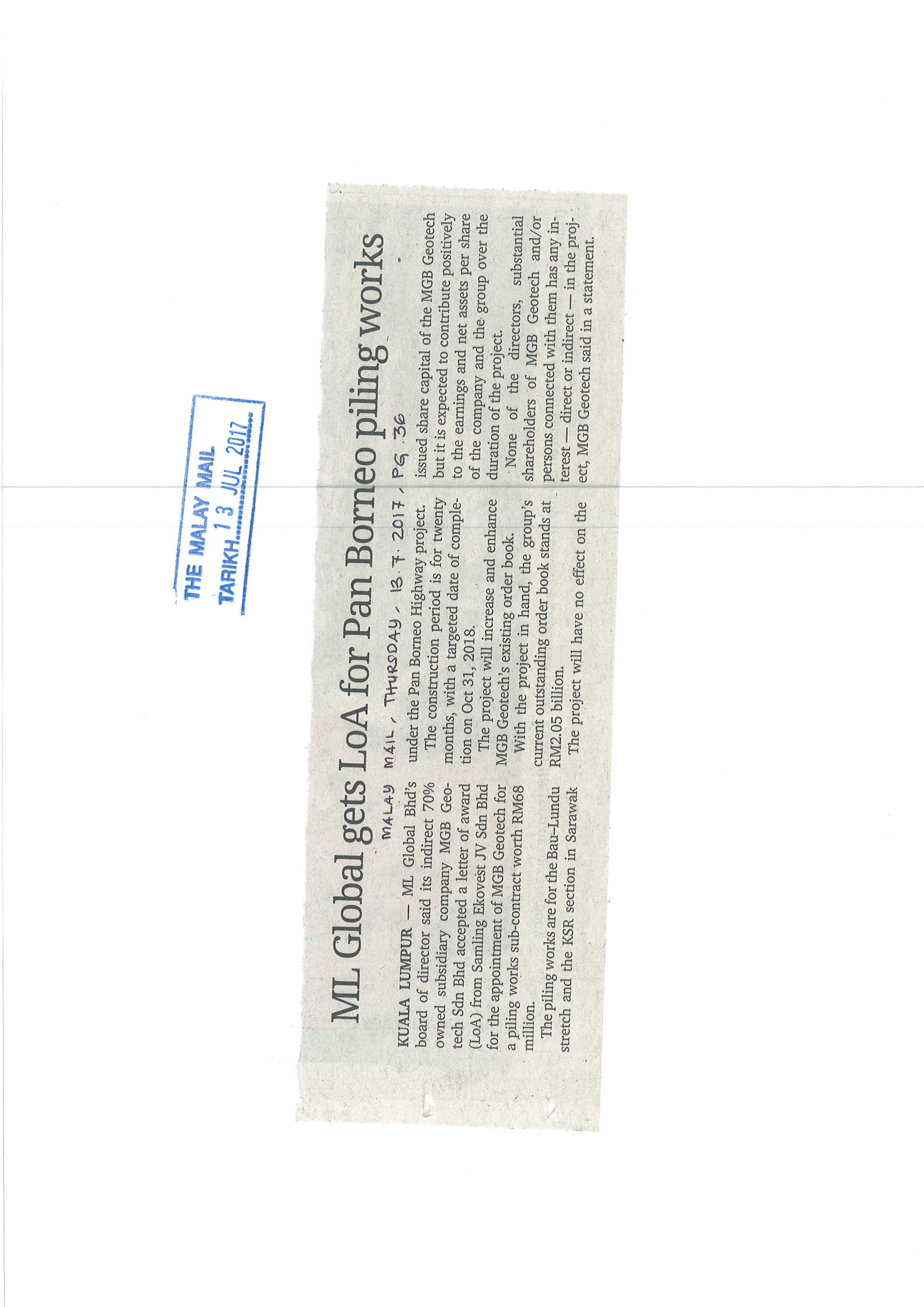 Tarikh Kha, 13/07/2017 - 12:00 Surat Khabar The Malay Mail File attachments TMM 13072017- ML Global Ges LoA For Pan Borneo Piling Works_0.jpg (820.03 KB)