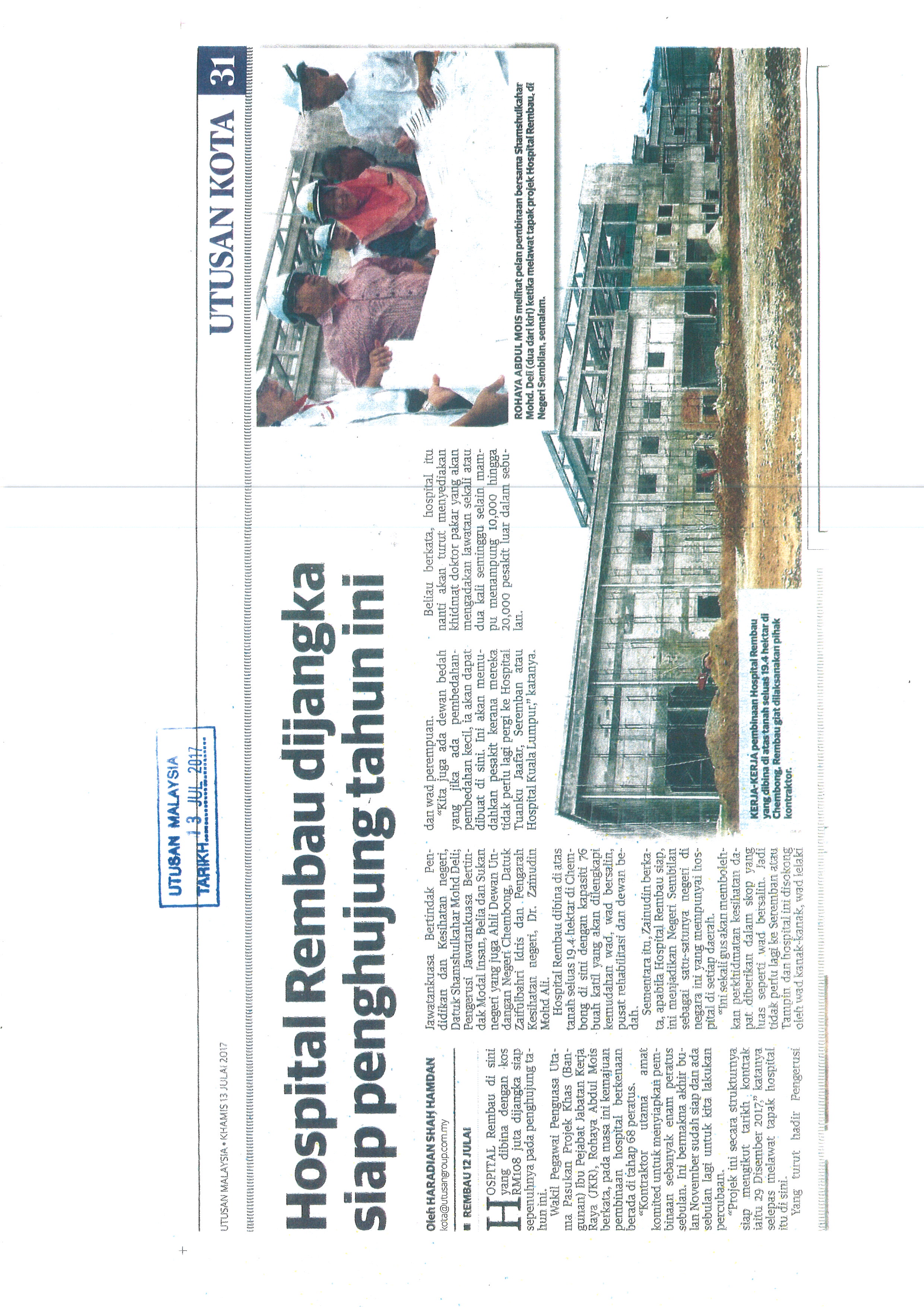 Tarikh Kha, 13/07/2017 - 12:00 Surat Khabar Utusan Malaysia File attachments UM 13072017- Hospital Rembau Dijangka Siap Penghujung Tahun Ini_0.jpg (1.64 MB)