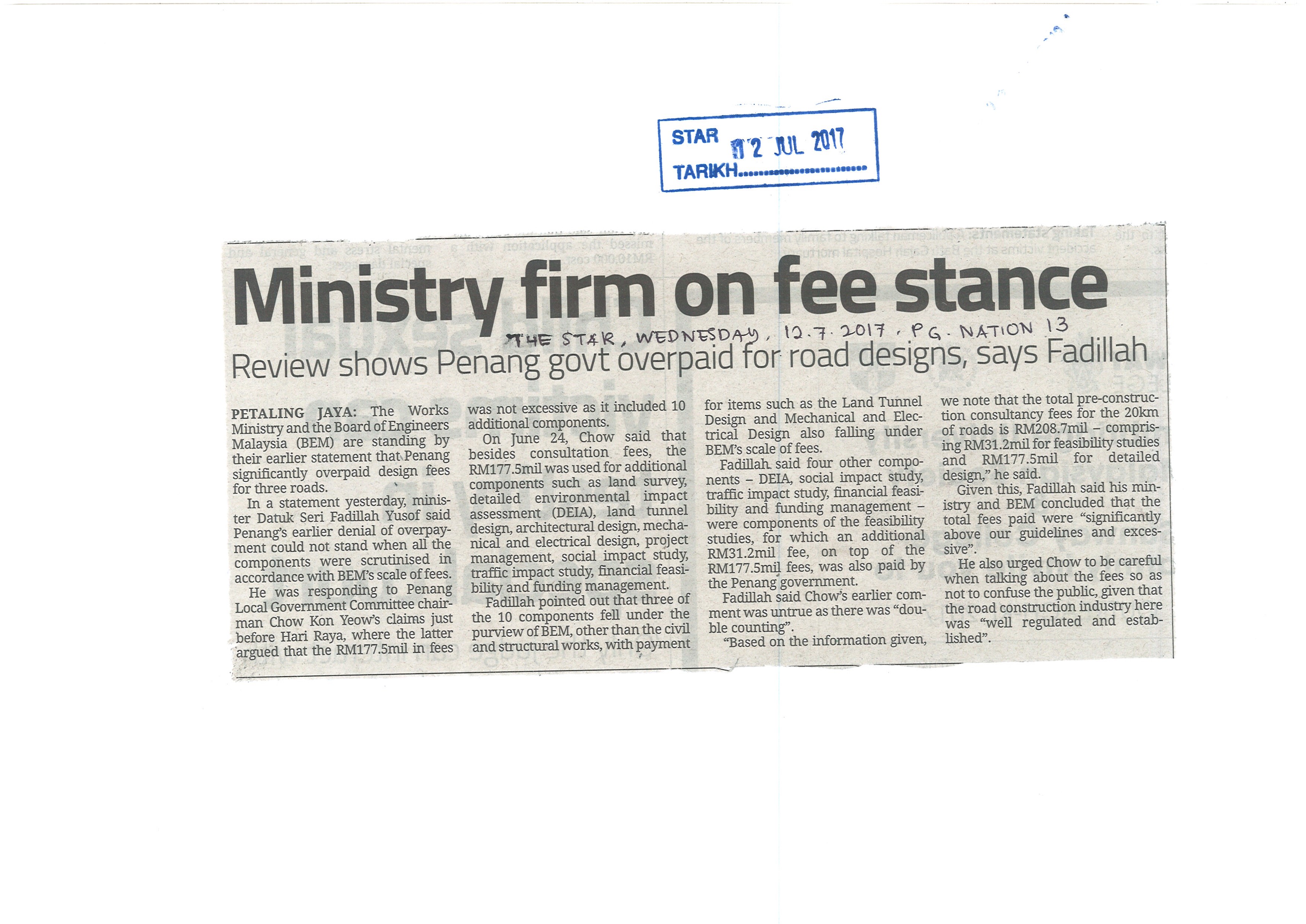 Tarikh Rab, 12/07/2017 - 12:00 Surat Khabar The Star File attachments STAR 12072017- Ministry Firm On Fee Stance_0.jpg (1.14 MB)