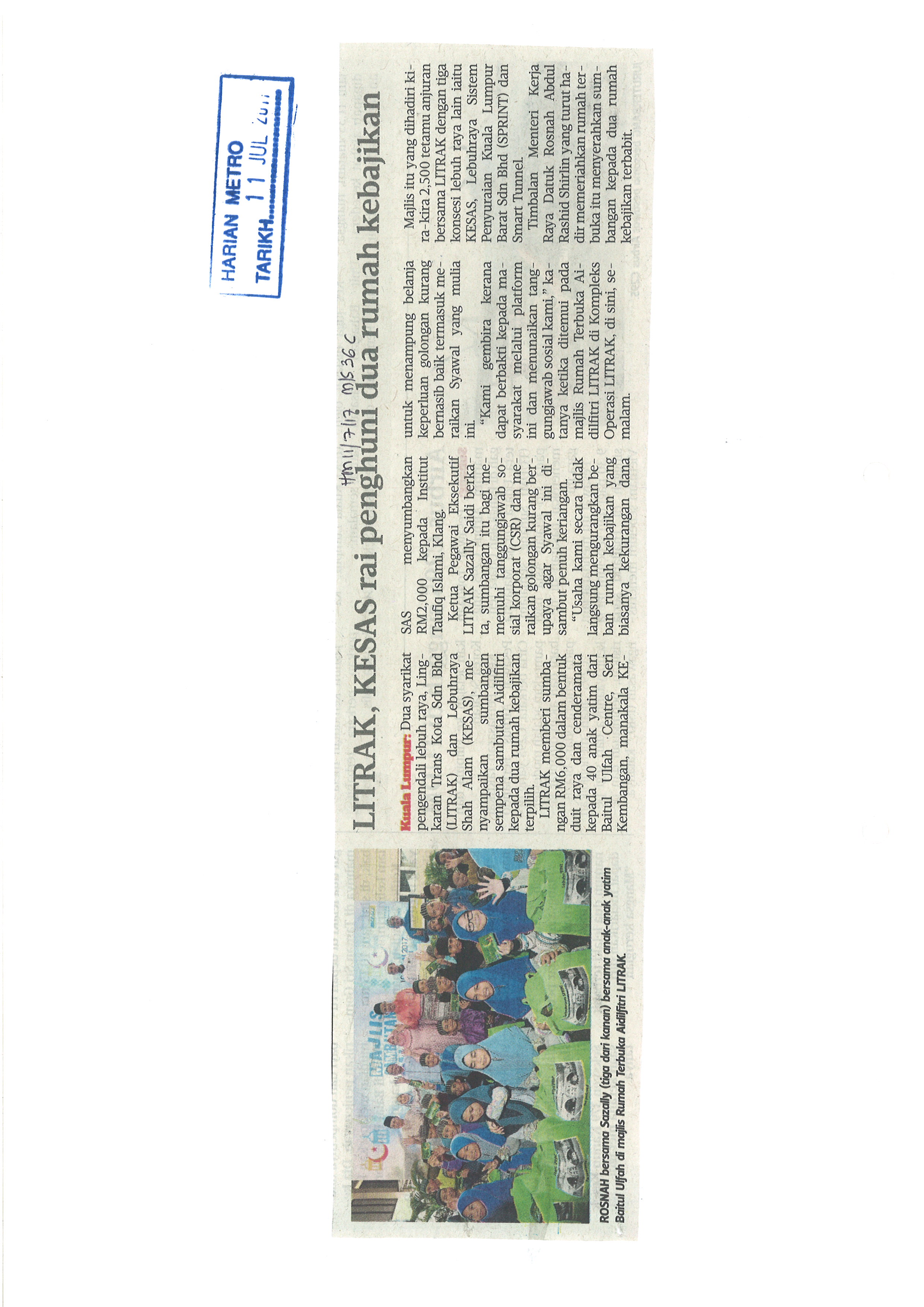 Tarikh Sel, 11/07/2017 - 12:00 Surat Khabar Harian Metro File attachments HM 11072017- LITRAK, KESAS Rai Penghuni Dua Rumah Kebajikan_0.jpg (1.11 MB)