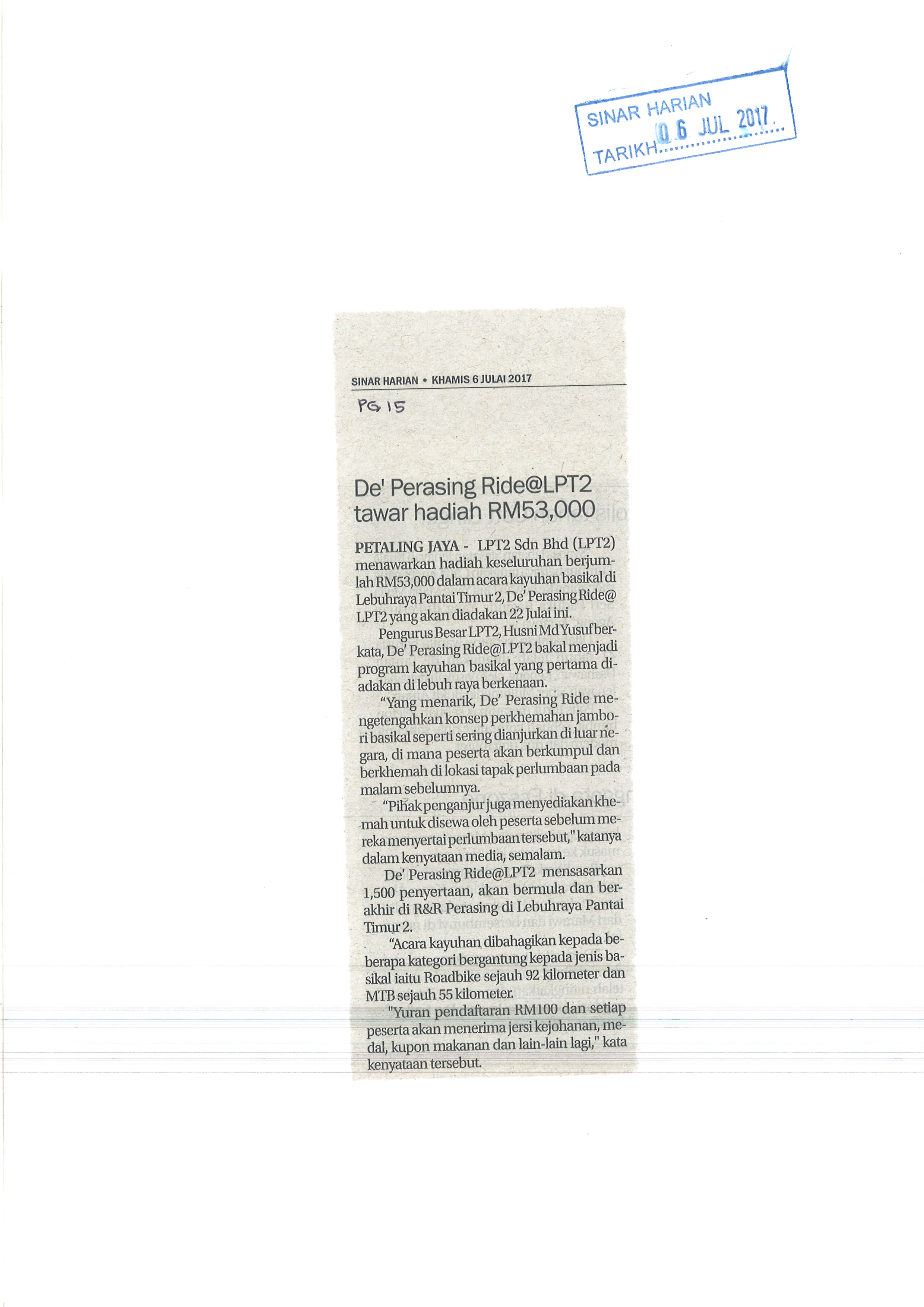 Tarikh Kha, 06/07/2017 - 12:00 Surat Khabar Sinar Harian File attachments SH 06072017- De' Perasing Ride@LPT2 Tawar Hadiah RM 53,000_0.jpg (752.12 KB)
