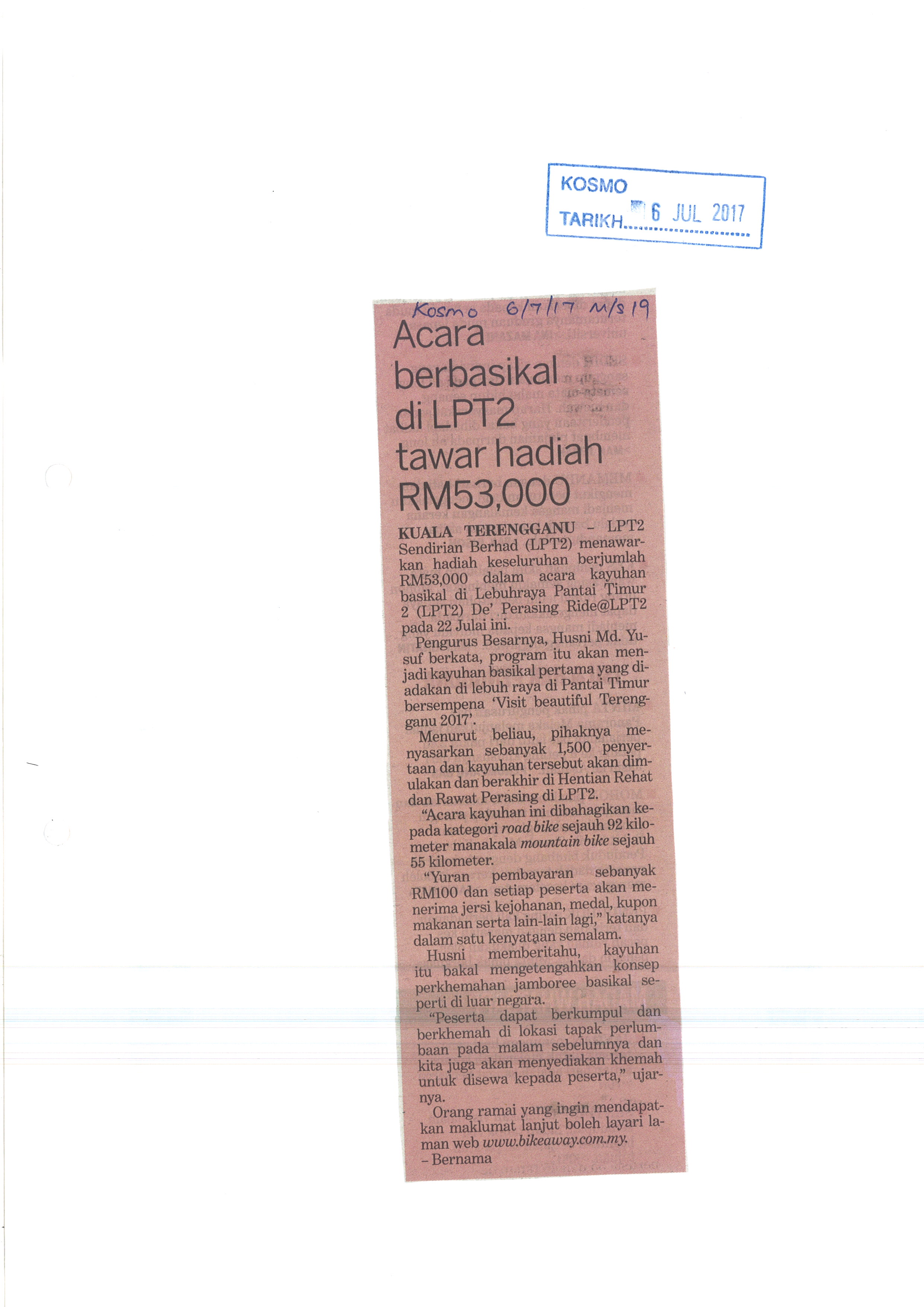 Tarikh Kha, 06/07/2017 - 12:00 Surat Khabar Kosmo File attachments KOSMO 06072017- Acara Berbasikal Di LPT2 Tawar Hadiah RM 53,000_0.jpg (890.81 KB)