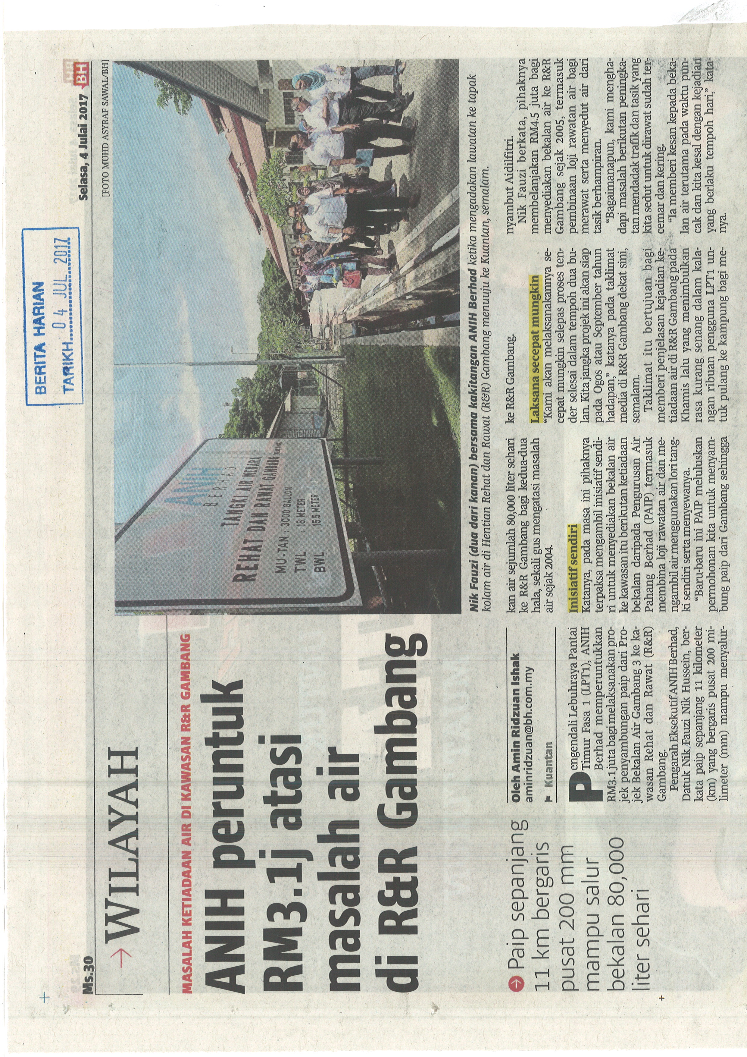 Tarikh Sel, 04/07/2017 - 12:00 Surat Khabar Berita Harian File attachments BH 04072017- ANIH Peruntuk RM 3.1j Atasi Masalah Air Di R&R Gambang_0.jpg (2.42 MB)
