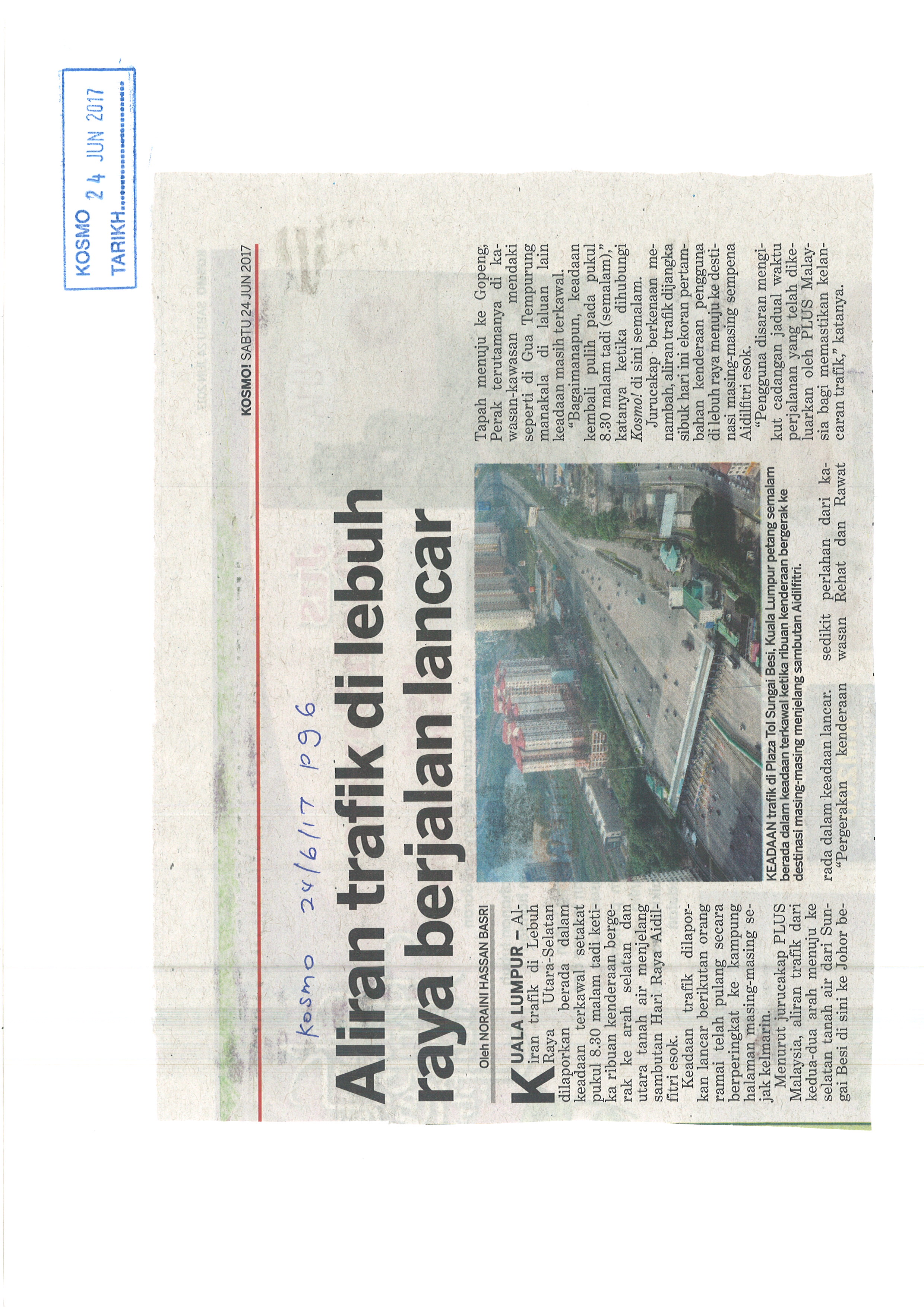 Tarikh Sab, 24/06/2017 - 12:00 Surat Khabar Kosmo File attachments KOSMO 24062017- Aliran Trafik Di Lebuhraya Berjalan Lancar_0.jpg (1.55 MB)