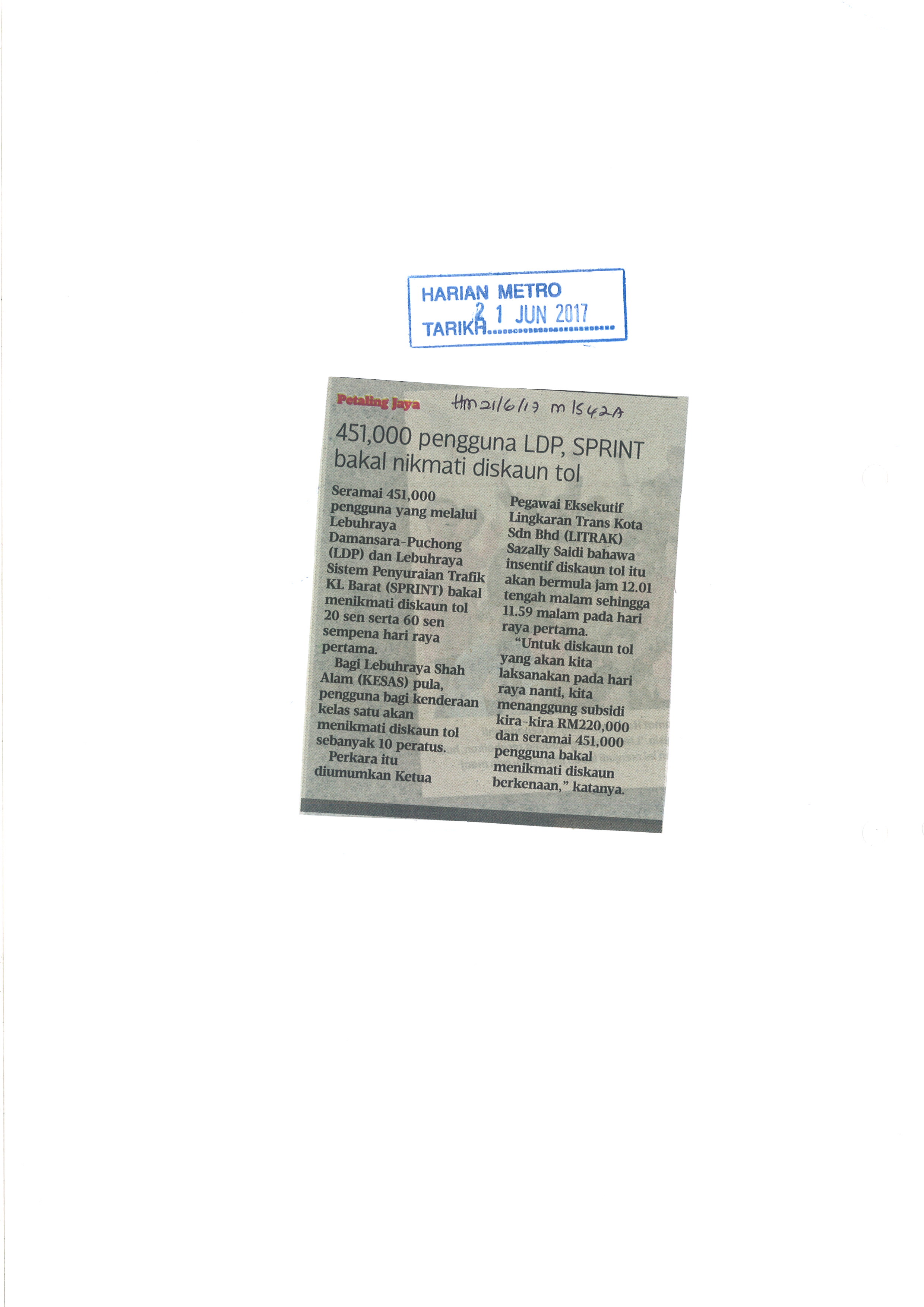 Tarikh Rab, 21/06/2017 - 12:00 Surat Khabar Harian Metro File attachments HM 21062017- 451,000 Pengguna LDP, SPRINT Bakal Nikmati Diskaun Tol_0.jpg (631.1 KB)