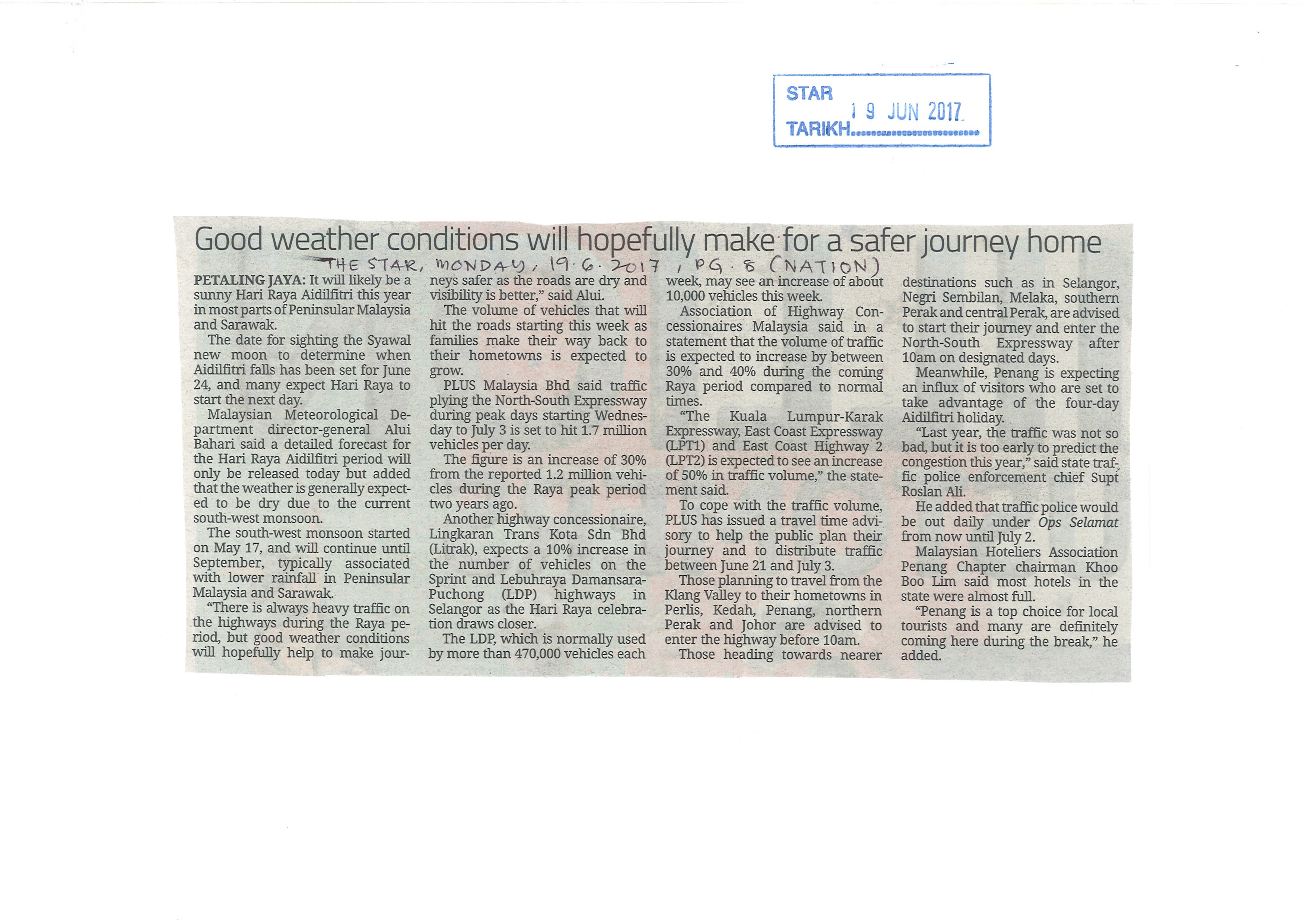 Tarikh Isn, 19/06/2017 - 12:00 Surat Khabar The Star File attachments STAR 18062017- Good Weather Conditions Will Hopefully Make For A Safer Journey Home_0.jpg (1.24 MB)
