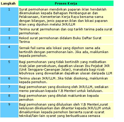 Risalah ini disediakan adalah sebagai panduan kepada agensi / syarikat mengenai proses permohonan dan kelulusan mendirikan paparan iklan di jalan dan Lebuhraya Persekutuan.