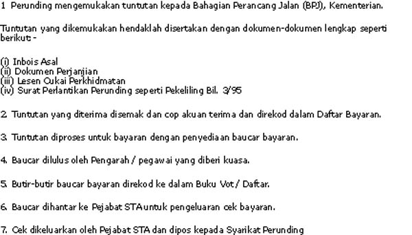 Syarikat-syarikat perunding yang menjalankan kerja-kerja kajian jalan akan mengemukakan tuntutan bayaran kemajuan kepada Bahagian Perancang Jalan (BPJ) Kementerian apabila sesuatu peringkat kerja tersebut telah disiapkan.