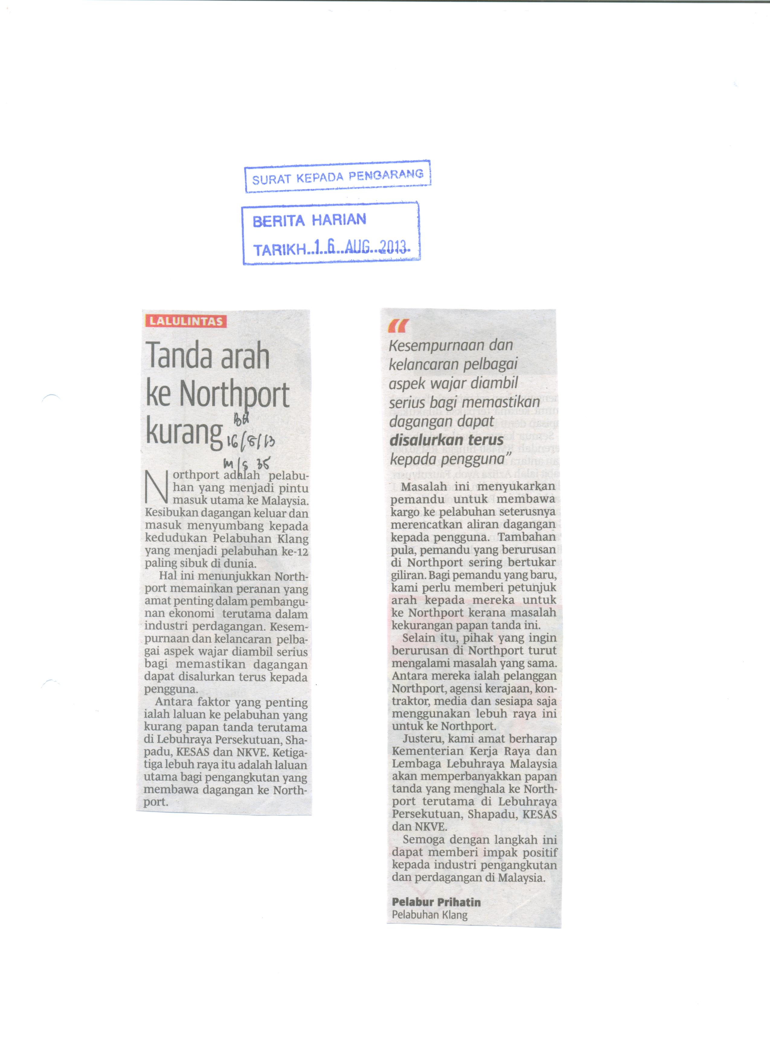 Tarikh Jum, 08/16/2013 - 20:00 Surat Khabar Berita Harian File attachments skp-bh-16-8-13- tanda arah ke Northport kurang 001 (1).jpg (501.41 KB) BERITA HARIAN 16 OGOS 2013 – SKP -TANDA ARAH KE NORTHPORT KURANG.pdf (57.82 KB)