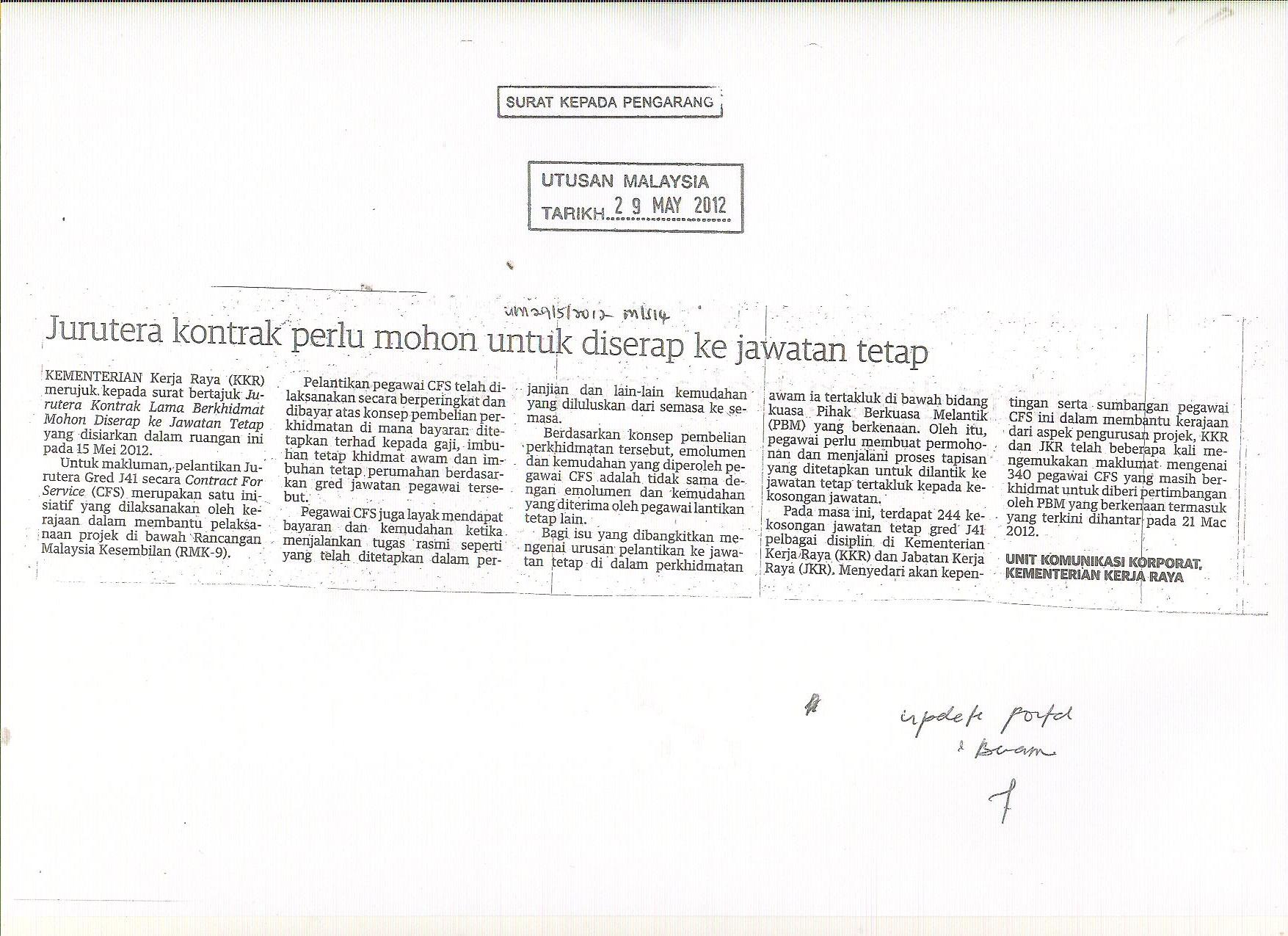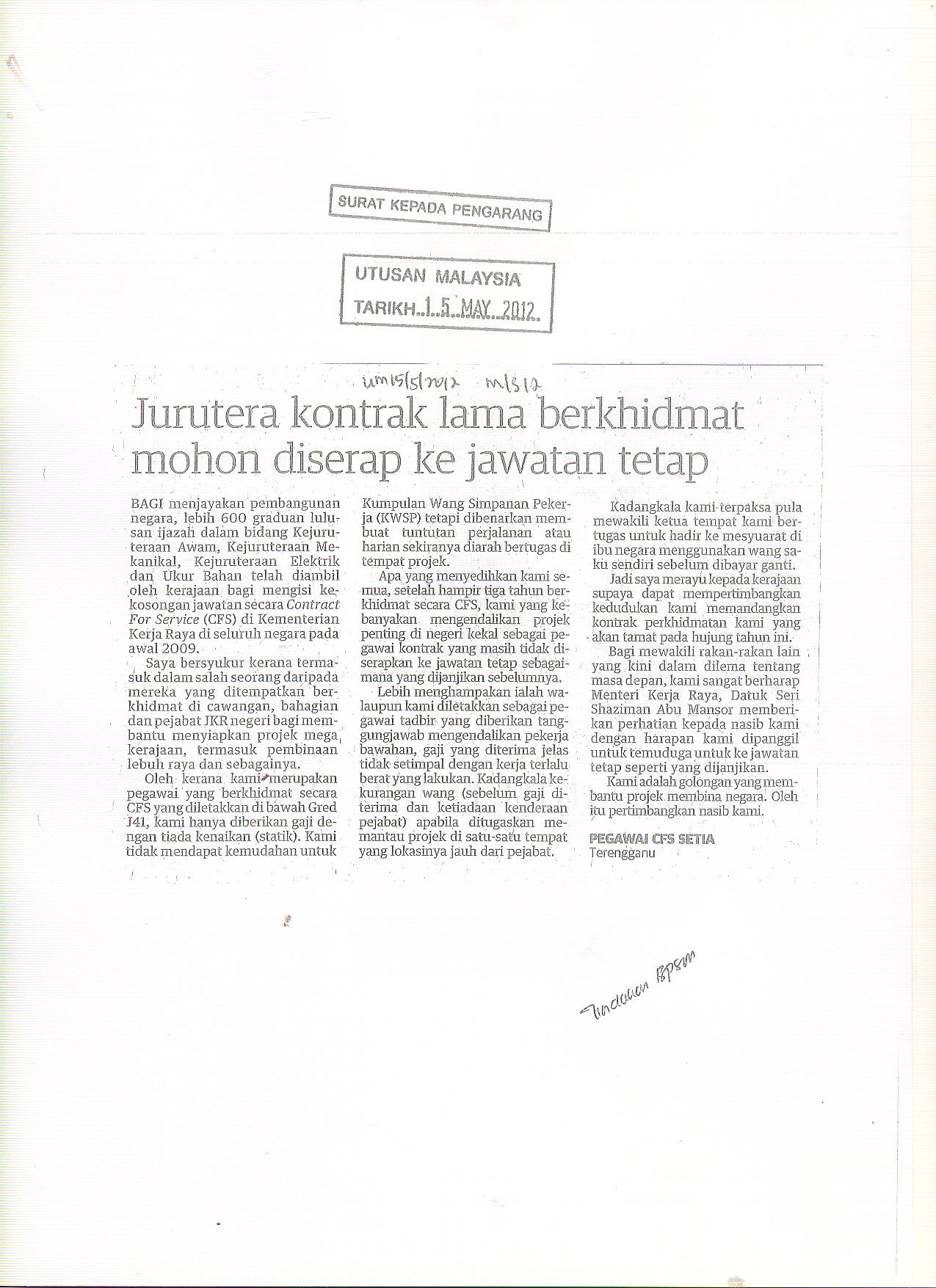 Tarikh Sel, 05/15/2012 - 20:00 Surat Khabar Utusan Malaysia File attachments Aduan-Jurutera kontrak lama berkhidmat mohon diserap ke jawatan tetap.jpg (311.47 KB) Jawapan-Jurutera kontrak perlu mohon untuk diserap ke jawatan tetap.jpg (308.57 KB)