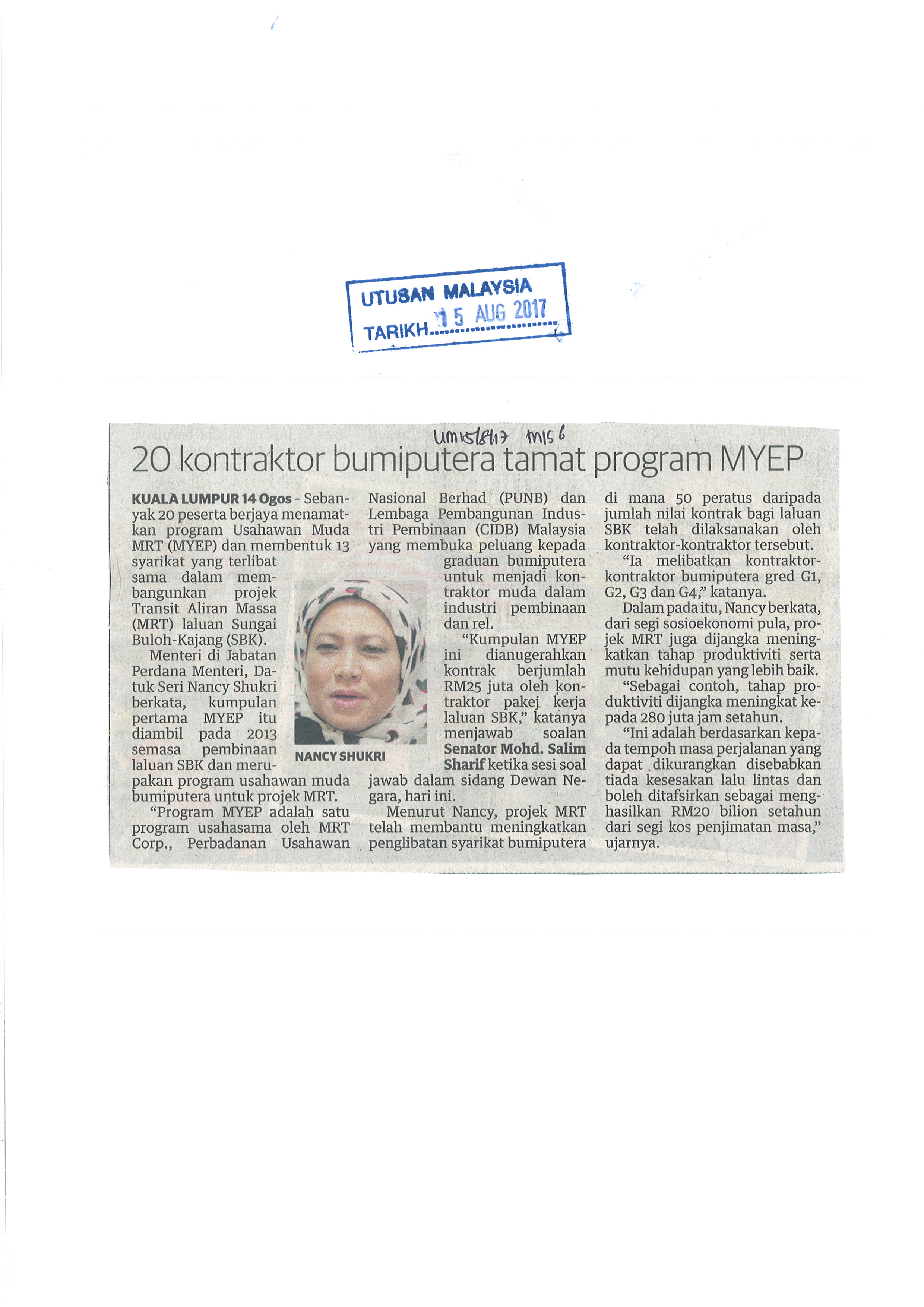 Tarikh Sel, 15/08/2017 - 12:00 Surat Khabar Utusan Malaysia File attachments UM 15082017- 20 Kontraktor bumiputera Tamat Program MYEP.jpg (1010.46 KB)